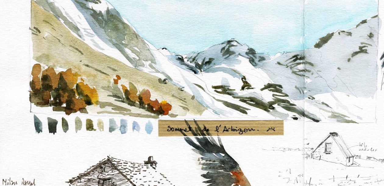 J2 : Départ pour une balade toute la journée, temps de marche et de dessin/aquarelle s’intercaleront pour laisser libre court à nos envies créatrices. Nous vous proposons de partir découvrir les vie des estives au travers d’un courtaou, témoin de la riche vie pastorale qui se déroulait dans cette vallée. Paysages de moyenne montagne surplombés par les sommets de l’Arbizon, Montarouye.