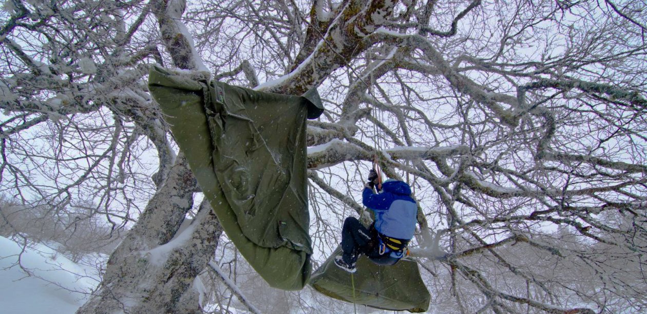 S’enfiler dans les duvet reste un sport peu simple dans ces conditions, mais nous voilà perché dans ce hêtre le temps d’une nuit d’hiver, de neige dans ces montagnes de Jaut.
